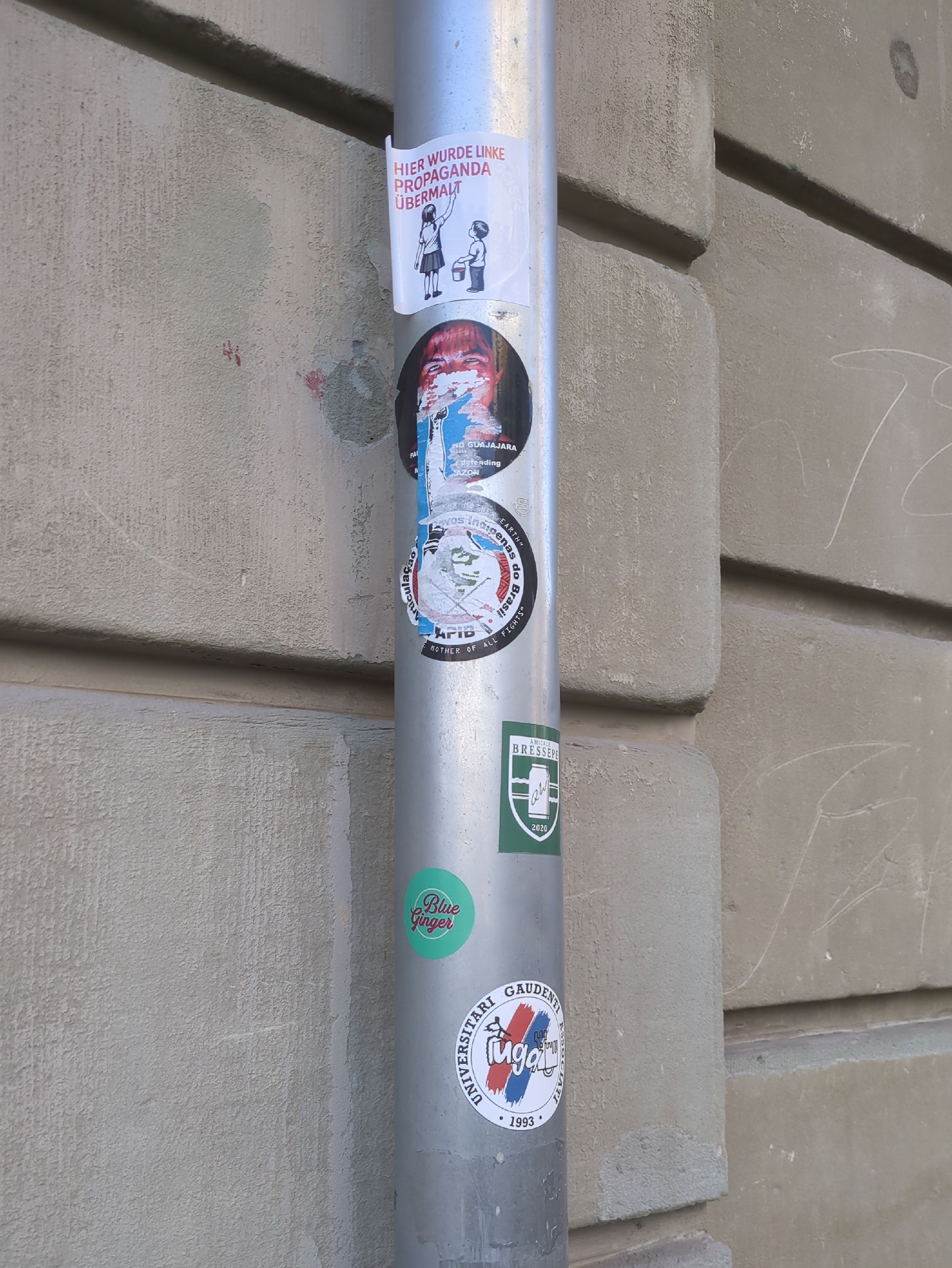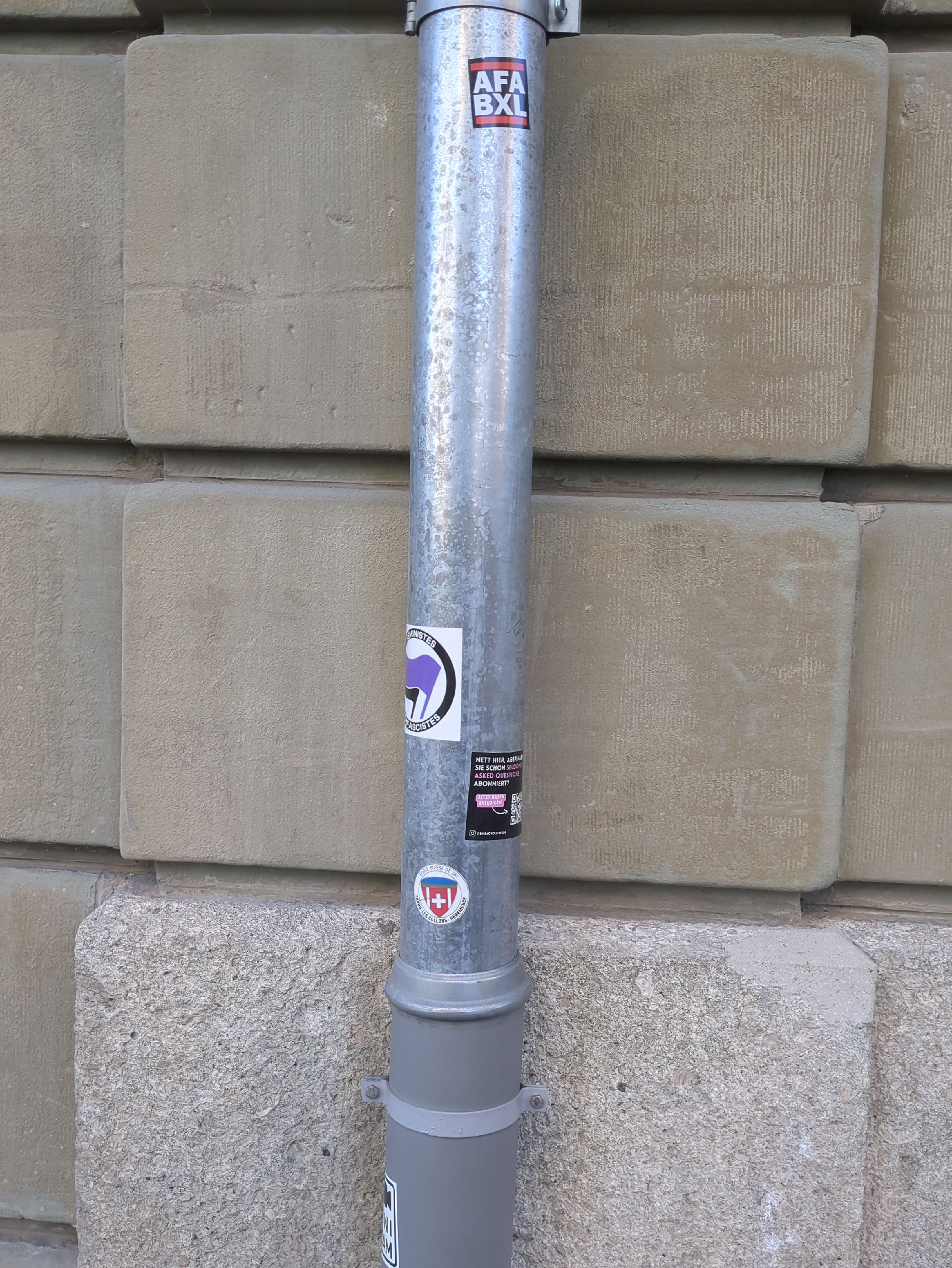 Sprache: Freiburger Bolz; links daneben 2 identische Schilder auf Französisch und Deutsch