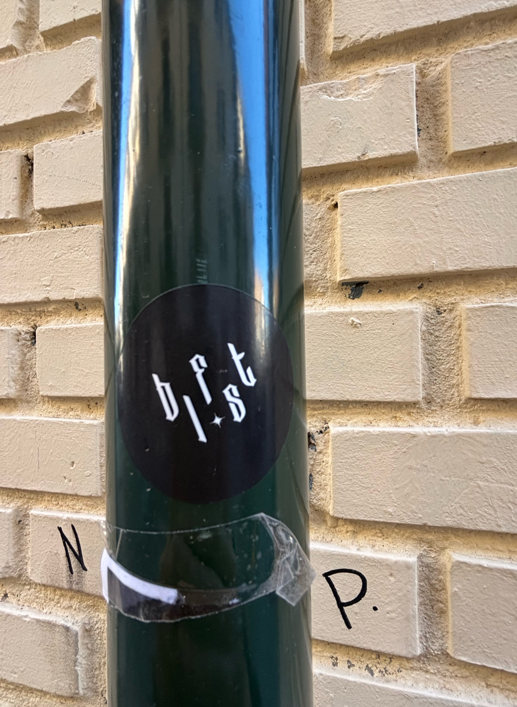 Mostly unreadable, but their presence shows the layered temporality of sticker culture: old, decayed messages beneath new ones.