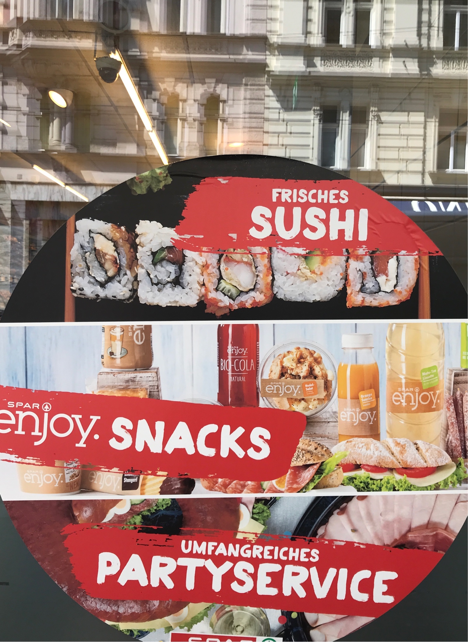 ENG: enjoy, snacks, partyservice, AMB: sushi DEU: rest