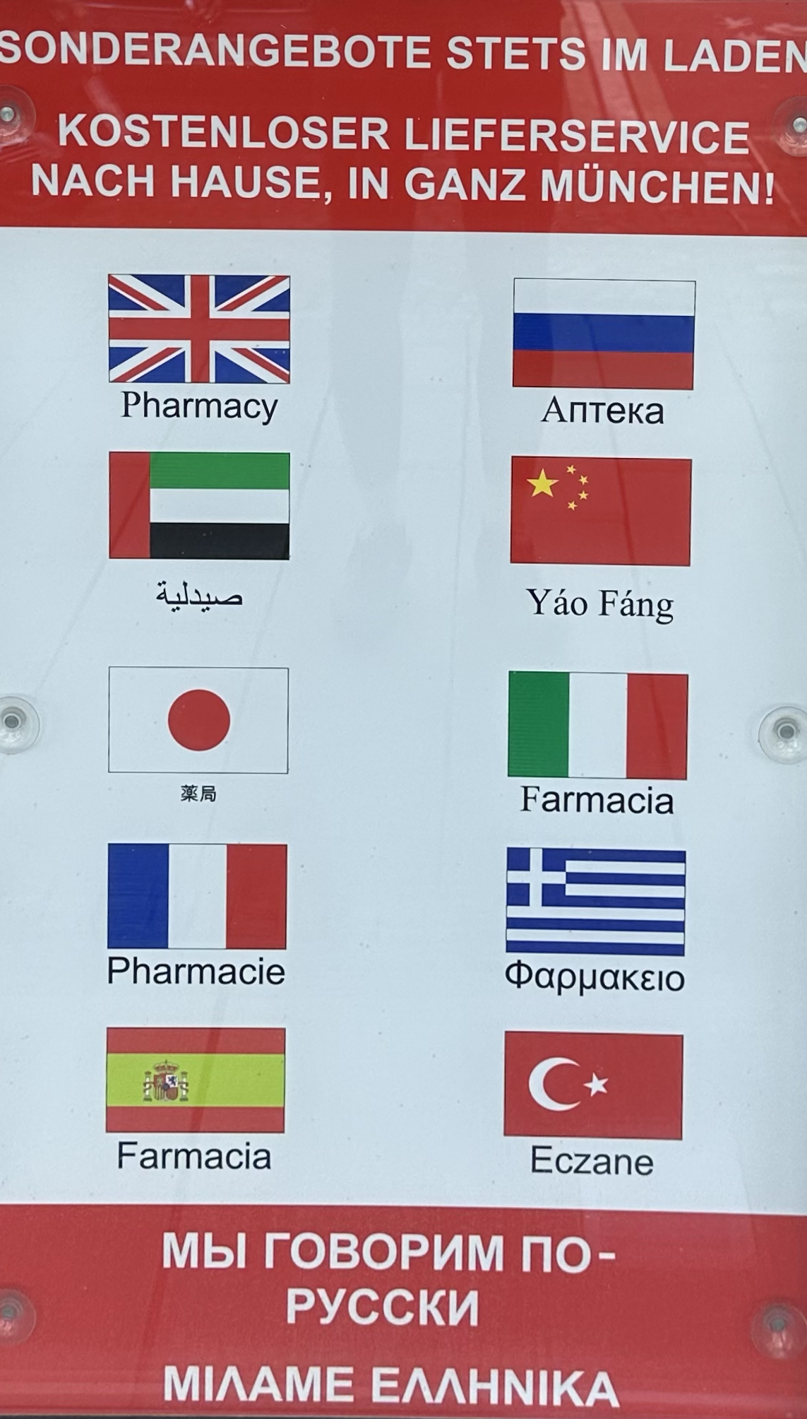 • Das Schild richtet sich an internationale Besucher und Kund:innen in einem urbanen, kommerziellen Kontext.